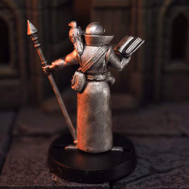 I ship worldwide. All prices in SEK (Swedish kronor). Fantasy miniature of a mage with staff and book in lead-free pewter in 28mm heroic scale. Rotationally cast for high detail level. Comes with a 25mm base. Works great for Drakar och Demoner, RuneQuest, Dragonbane or Dungeons & Dragons. Made by Irrbloss miniatures in Karlstad, Sweden.