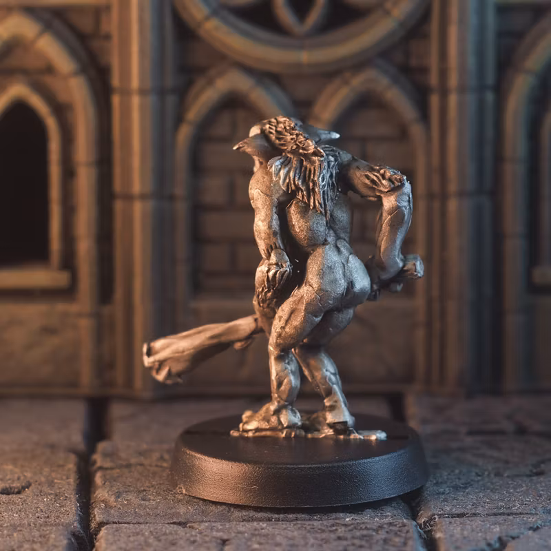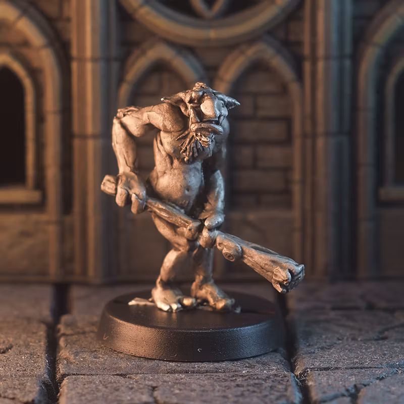 Miniature from hand-sculpted original of a troll with a club in lead-free pewter. Rotationally cast for high detail level. Comes with a 25mm base.