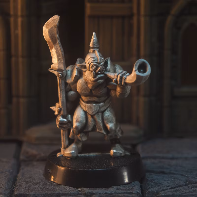 Fantasy miniature of a orc with sword and horn in lead-free pewter in 28mm scale. Rotationally cast for high detail level. Comes with a 25mm base. Works great for Drakar och Demoner, RuneQuest, Dragonbane or Dungeons & Dragons. Made by Irrbloss miniatures in Karlstad, Sweden.