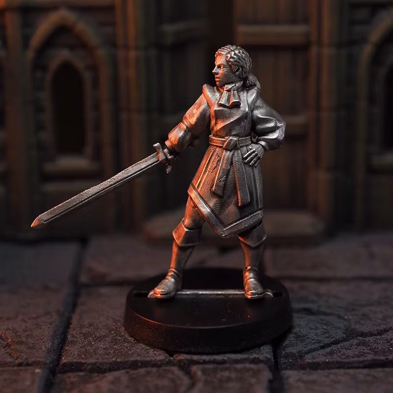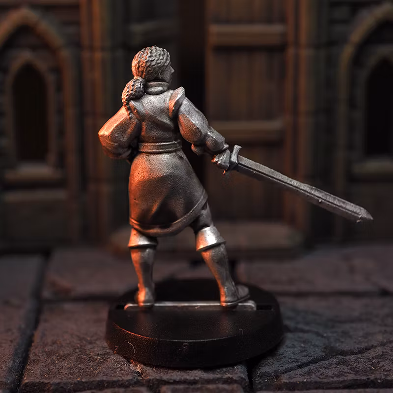 Fantasy miniatyr av en kvinnlig krigare med svärd i blyfritt tenn i 28mm heroic skala. Rotationsgjuten för hög detaljnivå. Kommer med 25mm bas. Passar utmärkt till spel som Drakar och Demoner, RuneQuest, Dragonbane eller Dungeons & Dragons. Tillverkad av Irrbloss miniatures i Karlstad, Sverige.