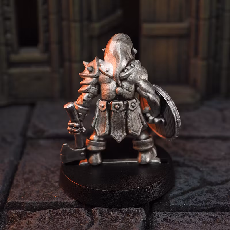 Fantasy miniature of a goblin with axe and shield in lead-free pewter in 28mm heroic scale. Rotationally cast for high detail level. Comes with a 25mm base. Works great for Drakar och Demoner, RuneQuest, Dragonbane or Dungeons & Dragons. Made by Irrbloss miniatures in Karlstad, Sweden.